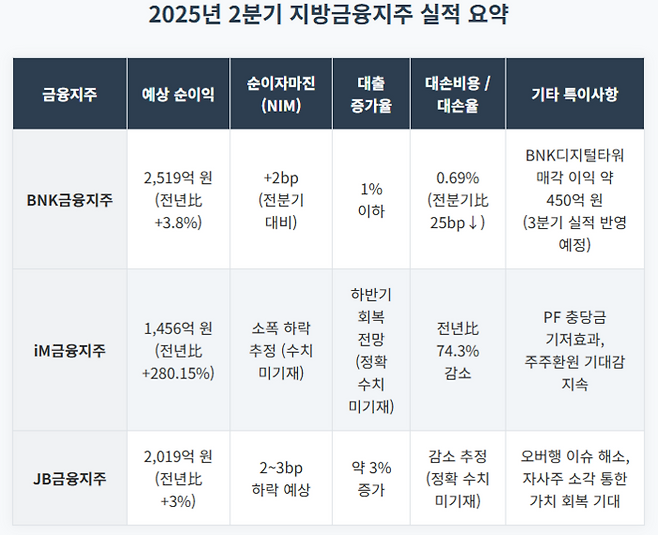 지방금융지주들의 실적 성장세에 제동을 걸던 충당금 적립 부담 완화로 2분기 역대 분기 최대 실적 경신이 예상된다.