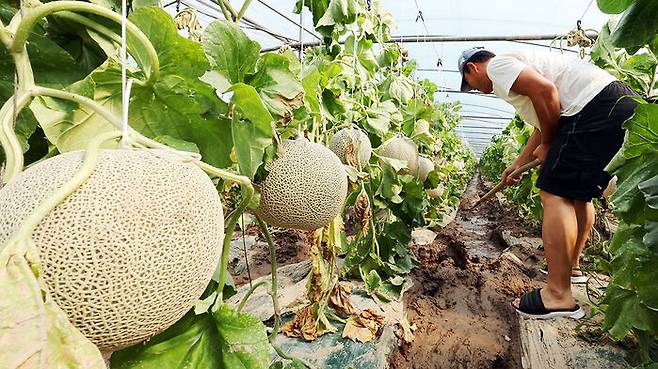 ▲ 20일 오전 전남 나주시 세지면 한 멜론 농장에서 농민이 물에 잠긴 비닐하우스 안 흙을 퍼내고 있다.