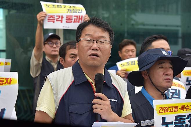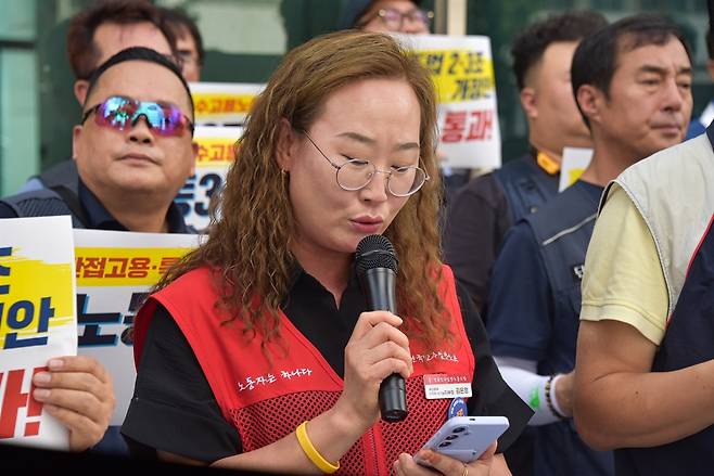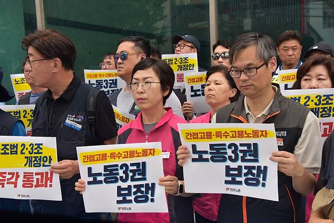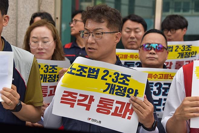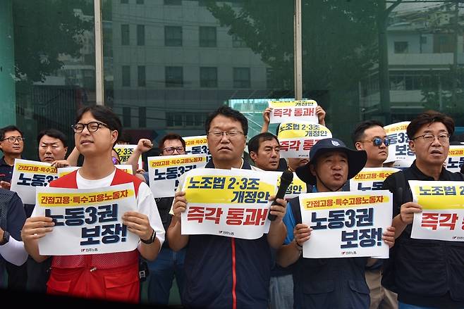 이어 원 지부장은 "노조법 상 근로자로 명시해서 노조할 권리, 단체 교섭할 권리, 파업할 권리를 정확하게 보장해 달라"라며 "이재명 정부는 국민 주권 정부라고 한다. 더불어민주당이 경총을 비롯한 자본가들과 더불어 갈 것인지, 우리 땀흘리는 노동자들과 더불어 갈 것인지 선택하라"고 말했다.
