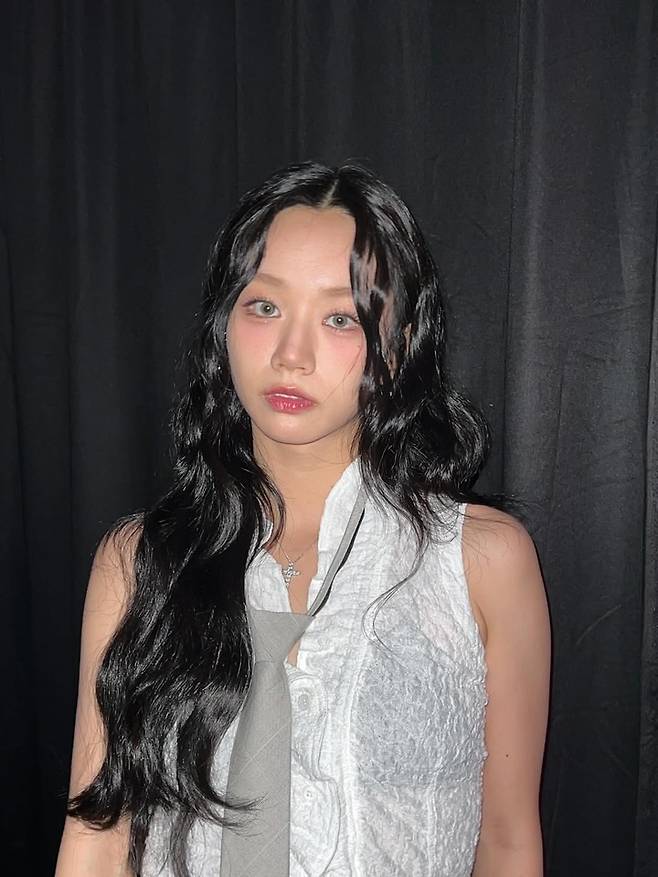 사진 속 혜리는 텍스처감 있는 흰색 슬리브리스 셔츠에 회색 넥타이를 매치해 시크하면서도 마치 하이틴 드라마 속 주인공 같은 느낌을 자아냈다. 이에 더해 물결 웨이브의 흑발이 룩과 조화를 이뤘다.