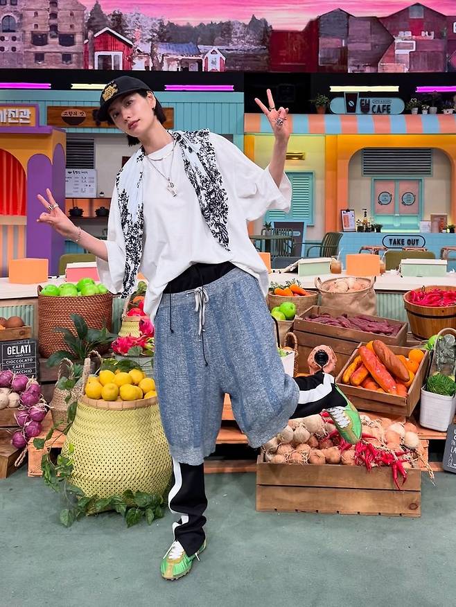 예능 촬영 현장에서 나나는 박시한 흰색 티셔츠에 블랙-화이트 스카프를 걸치고, 배기핏 데님 반바지와 트레이닝 팬츠를 레이어드했다.