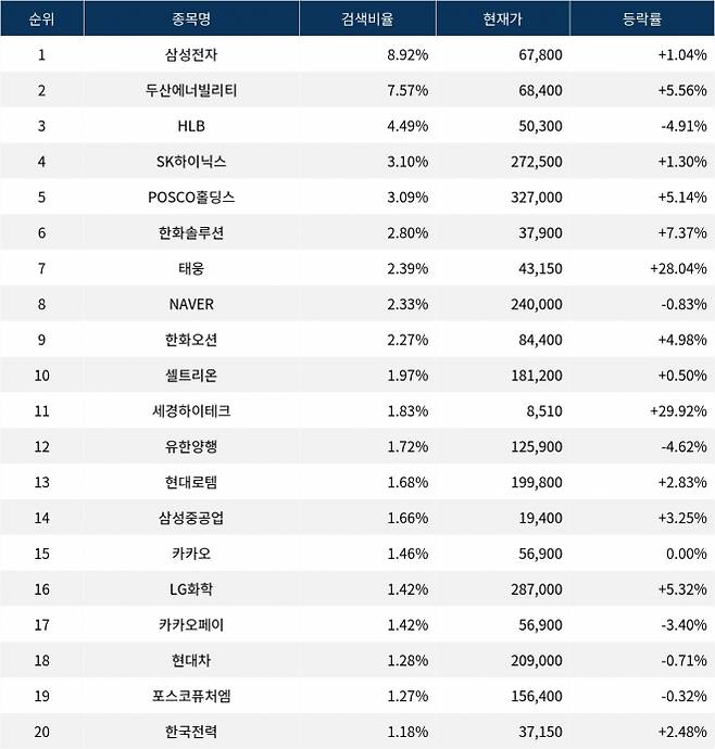이어 검색비율 2위의 두산에너빌리티(034020)는 상승률 5.56%로 상승 마감했다. 검색비율 3위의 HLB(028300)는 4.91% 하락 마감했다. 검색비율 4위 SK하이닉스(000660)는 상승률 1.30%로 상승했다. 검색비율 5위 POSCO홀딩스(005490)는 5.14% 상승했다.