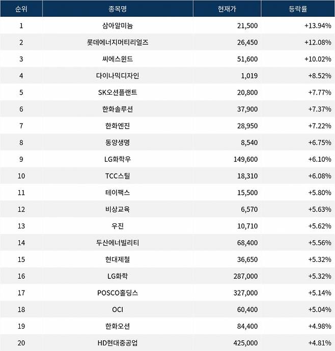6위 한화솔루션(009830)은 종가 37,900원으로 7.37% 상승 마감했다. 7위 한화엔진(082740)은 종가 28,950원으로 7.22% 상승 마감했다. 8위 동양생명(082640)은 종가 8,540원으로 6.75% 상승 마감했다. 9위 LG화학우(051915)는 종가 149,600원으로 6.10% 상승 마감했다. 10위 TCC스틸(002710)은 종가 18,310원으로 6.08% 상승 마감했다.