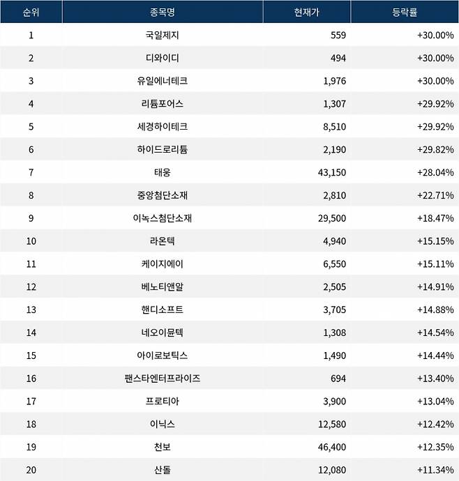 6위 하이드로리튬(101670)은 종가 2,190원으로 29.82% 폭등 마감했다. 7위 태웅(044490)은 종가 43,150원으로 28.04% 폭등 마감했다. 8위 중앙첨단소재(051980)는 종가 2,810원으로 22.71% 폭등 마감했다. 9위 이녹스첨단소재(272290)는 종가 29,500원으로 18.47% 급등 마감했다. 10위 라온텍(418420)은 종가 4,940원으로 15.15% 급등 마감했다.