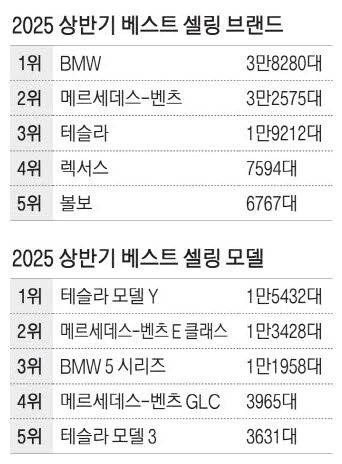 차종별 기준으로 1위는 역시 테슬라 모델 Y였다. 1만5432대로 1위 자리를 지켰다. 2위는 메르세데스-벤츠 E클래스로 1만3428대 팔렸고, 1만1958대 팔린 BMW 5 시리즈가 3위로 뒤를 이었다. 상반기 1만대 이상 판매를 기록한 모델은 이 3개뿐이었다. 4위는 메르세데스-벤츠 GLC 3965대, 5위는 테슬라 모델 3로 3631대 신규 등록됐다.