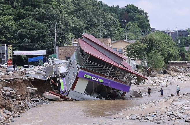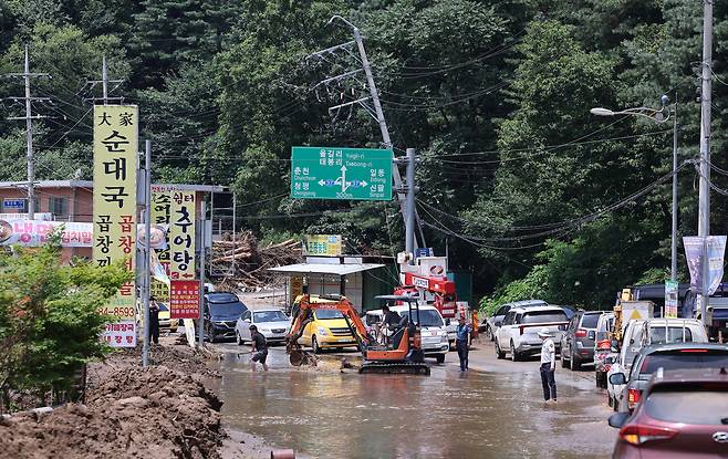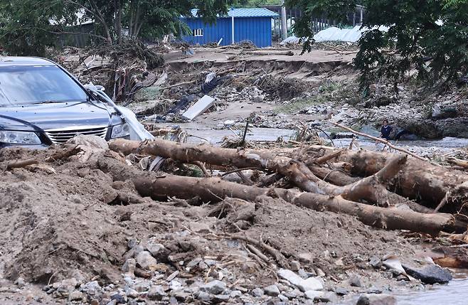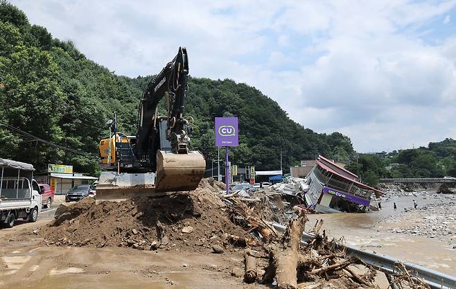경기 북부에 시간당 80mm에 달하는 폭우가 쏟아진 다음 날인 21일 경기 가평군 상면 원흥리에서 주민들이 피해 복구 작업을 벌이고 있다. 지난 16일부터 전국에 쏟아진 기록적인 폭우로 18명이 숨지고 9명이 실종되는 등 피해가 속출했다.