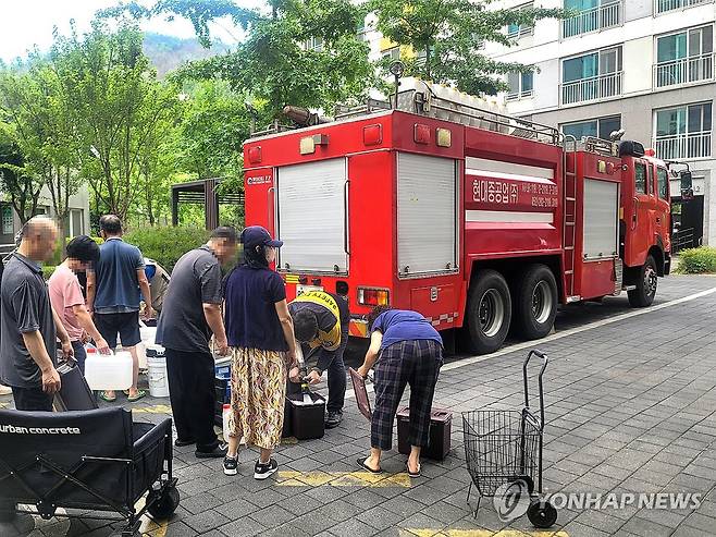 (울산=연합뉴스) 21일 이틀째 단수가 이어지고 있는 울산시 울주군 언양읍 한 아파트 주민들이 기업체 사내 소방차가 공급하는 생활용수를 받고 있다. 울산시 상수도사업본부에 따르면 지난 18일과 19일 내린 집중호우로 상수도 송수관로가 파손돼 지난 20일 오전부터 울주군 6개 읍·면 지역에 수돗물 공급이 중단됐다. 2025.7.21 [HD현대중공업 제공. 재판매 및 DB 금지]