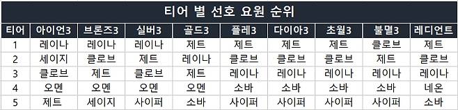 소위 '심해' 티어로 불리는 아이언, 브론즈, 실버는 '레이나', 플레티넘 이상 티어는 '제트'가 가장 인기가 많다.