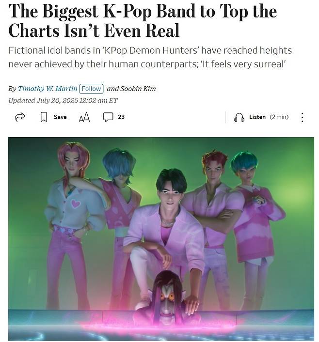 20일(현지시간) <월스트리트저널(WSJ)>는 "차트 정상을 차지한 가장 큰 케이팝 밴드는 실제로 존재하지 않는다(The Biggest K-Pop Band to Top the Charts Isn't Even Real)"라는 제목의 기사를 보도했다.