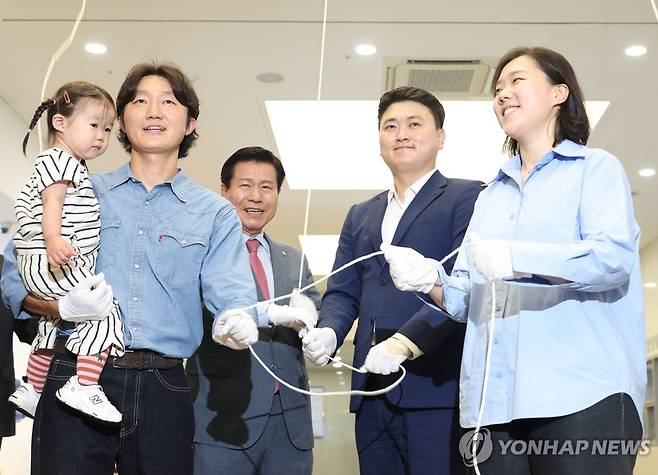 (대구=연합뉴스) 박세진 기자 = 21일 대구 중구 인구가 27년 만에 10만명을 회복해 열린 기념식에서 10만번째 전입한 일가족과 류규하 중구청장(왼쪽 두 번째), 김동현 중구의장이 기념 촬영을 하고 있다. 2025.7.21
