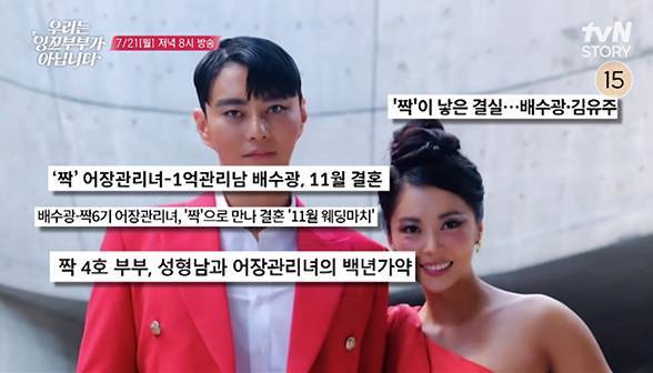 21일 tvN STORY에서 방송되는 부부 고민 거울 치료 드라마 테라피 ‘우리는 잉꼬부부가 아닙니다’ 4회에는 인기 예능 ‘짝’에 출연한 것이 인연이 되어 결혼까지 골인한 배수광, 김유주 부부가 출연, 깜짝 놀랄 반전 근황을 공개해 궁금증을 증폭시킨다.