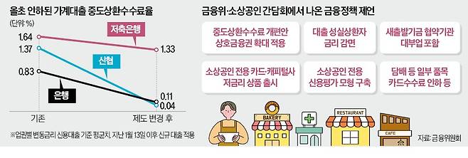 농협, 수협, 새마을금고 등 상호금융업권의 대출 중도상환수수료가 올 하반기 대폭 인하된다. 금융위원회가 소상공인 현장 간담회에서 들은 의견을 발 빠르게 정책으로 추진하면서다. 지역 밀착형 서민금융기관인 상호금융업권이 중도상환수수료 인하에 동참하며 소상공인에게 상당한 혜택이 돌아갈 것으로 예상된다. 일각에선 새 정부 초기에 금융당국 정책이 소상공인 지원에 집중되면서 다른 과제들이 후순위로 밀려나고 있다는 지적도 나온다.
