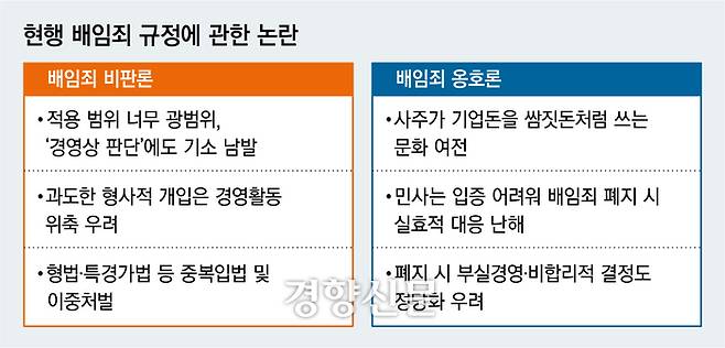 배임죄 논란은 그러나 그간 찬성과 반대가 치열하게 갈렸던 만큼 향후 논의 과정에서 진통이 예상된다. 배임죄 규정을 폐지하거나 완화하자는 측은 경영상 합리적인 판단을 했더라도 결과적으로 회사에 손해가 발생했다면 고의 여부와 무관하게 형사처벌이 가능하다는 점에서 문제를 제기해왔다. 경영상 판단에 형사처벌을 과도하게 적용한다면 과감한 경영 활동이 위축될 수 있다는 비판도 나왔다.