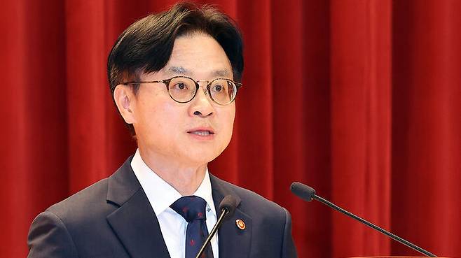▲ 김정관 산업통상자원부 장관이 21일 정부세종청사 산업통상자원부 강당에서 열린 취임식에서 취임사를 하고 있다.