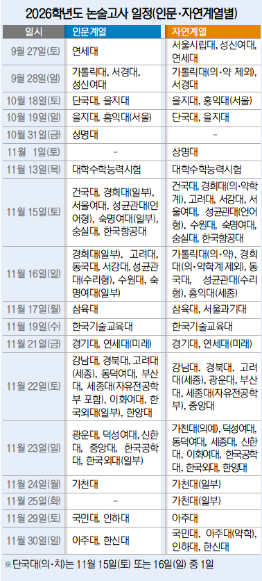 수능 직후 주말부터는 논술 일정이 본격적으로 몰린다. 11월 15일과 16일에는 건국대, 경희대, 고려대, 동국대, 서강대, 서울여대, 성균관대, 수원대, 숙명여대, 숭실대, 한국항공대 등 주요 대학이 시험을 치른다. 다음 주인 11월 22일과 23일에는 15개 대학이 논술고사를 실시하며, 부산대와 경북대 같은 국립대도 이 시기에 시험을 진행한다. 일부 대학은 평일 논술도 시행한다. 삼육대, 서울과학기술대, 한국기술교육대, 연세대(미래), 경기대, 가천대 등이 이에 해당되며, 대부분 고등학교에서 출석 인정이 가능하므로 평일 시험도 부담 없이 준비할 수 있다.