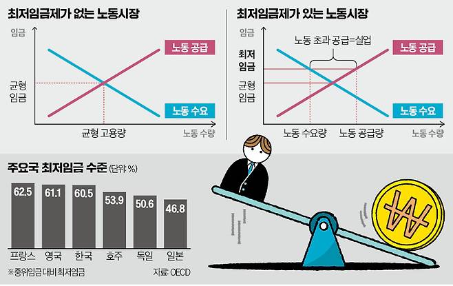 최저임금이 균형임금보다 낮은 수준에서 설정된다면 시장에 아무런 영향을 미치지 못한다. 노동시장의 수요·공급에 따라 모든 근로자가 최저임금보다 높은 임금을 받을 것이기 때문이다. 최저임금이 균형임금보다 높다면 복잡해진다. 가격이 오르면 공급량은 증가하고 수요량은 감소한다는 원리가 노동시장에도 적용된다. 노동의 공급 과잉이 발생해 공급이 수요를 초과하는 만큼 실업이 생긴다.