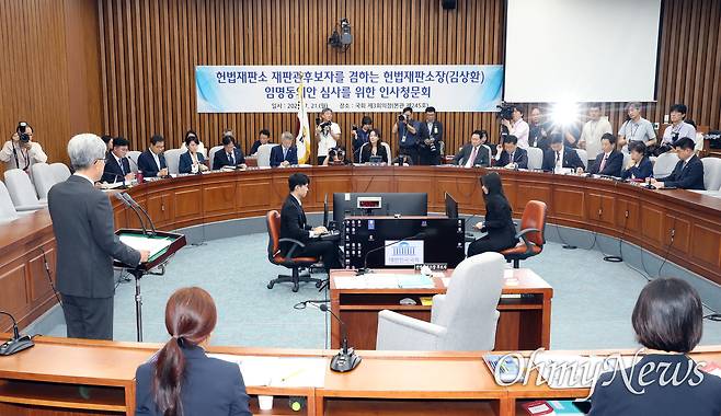 | ▲ 김상환 헌법재판소장 후보자가 21일 국회에서 열린 인사청문회에서 의원 질의에 답변하고 있다. |