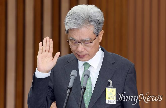 | ▲ 김상환 헌법재판소장 후보자가 21일 국회에서 열린 인사청문회에서 선서하고 있다. |