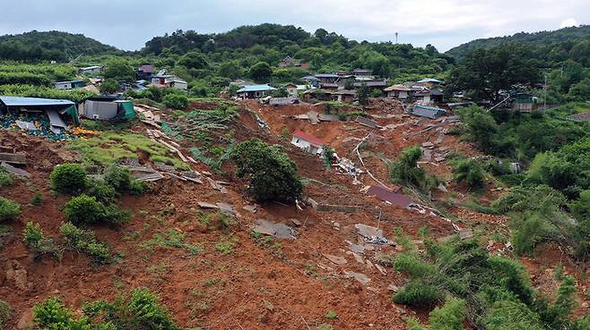 ▲ 21일 오후 경남 산청군 생비량면 상능로 산기슭에 위치한 일대 마을이 최근 발생한 집중호우·산사태 여파로 매몰돼 있다.