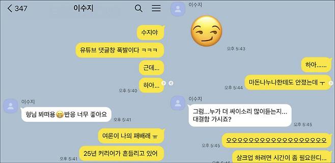 이후 뜨거운 반응에 싸이가 이수지에 직접 연락한 것. 싸이는 "유튜브 댓글창 폭발이다. 근데 여론이 나의 패배래. 25년 커리어가 흔들리고 있어"라며 이수지를 치켜세웠고 이수지는 "그러니까 오늘 야식 드시고 주무셔라"라고 너스레를 떨었다.