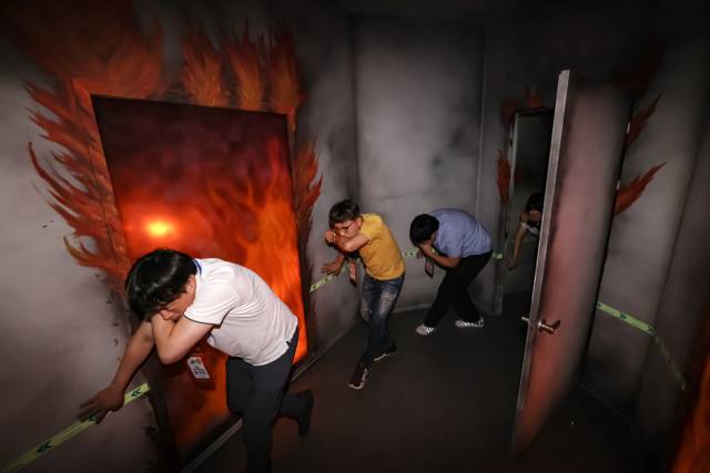 21일 오후 부산 강서구 명지동 부산학생안전체험관에서 ‘2025 하계 교직원 안전 체험 직무연수’가 열렸다. 연수 참가자들이 화재 발생에 대비한 긴급 대피법을 체험하고 있다.