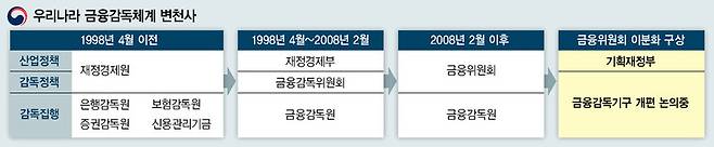 이 논쟁은 1997년 외환위기 당시로 거슬러 올라간다. 당시 우리 경제의 목줄을 쥔 국제통화기금(IMF)은 금융감독 기구의 독립성을 요구했다. 금융정책과 금융감독 전반을 관장한 재무관료의 관치 탓에 외환위기가 왔다는 문제의식이 가장 컸던 탓이다. 이에 따라 금융감독위원회가 신설됐고, 은행·보험·증권 등 업권별로 나뉘어 있던 감독 기능을 통합해 무자본 특수법인 형태의 민간기관인 금융감독원이 출범했다.