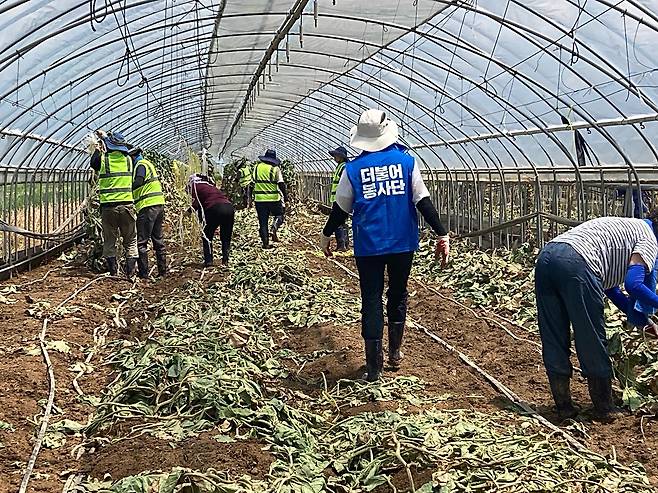 | ▲ 더불어민주당이 21일 오전 충남 예산군 신암면 조곡리 수해 현장을 찾아 봉사활동을 하고 있다. 체감온도 32도 하우스 안에서 깨지고 터진 수박을 도랑에 버린 뒤 멀칭 비닐을 바깥으로 끄집어내고 있는 모습. |