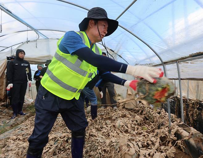 | ▲ 더불어민주당 정청래 의원이 21일 오전 충남 예산군 신암면 조곡리 수해 현장을 찾아 복구 지원활동을 하고 있다. 2025.7.21 |