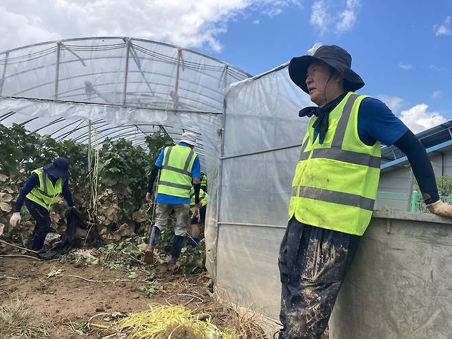 현장에서 만난 피해 농민 이아무개(60, 남)씨는 "여긴 지대가 높은 편이라 비가 와도 잘 빠지는 편이었다. 제가 농사를 33년 지었는데 비 때문에 이렇게 망가진 건 처음 봤다"며 "어떻게 살아야 할지 막막하고, 저보다 나이 드신 분들은 더 어려운 상황이다. 작업(복구) 때문에 사람을 사기도 하는데 수백 명이 와주니 고마울 따름"이라고 덧붙였다.