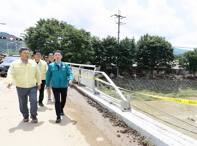 | ▲ 김성중 경기도 행정1부지사가 21일 오후 호우피해 및 복구현황 점검을 위해 가평 대보교를 방문해 상황을 점검하고 있다. |
