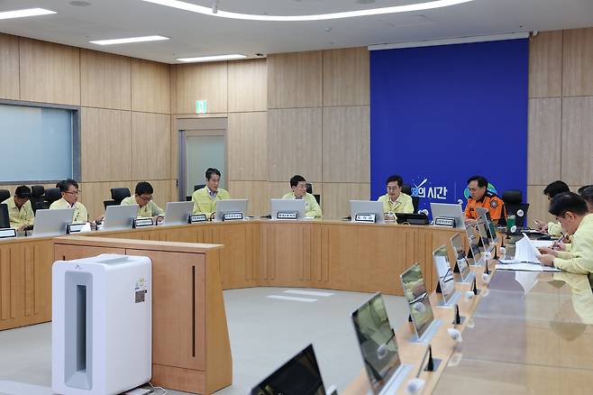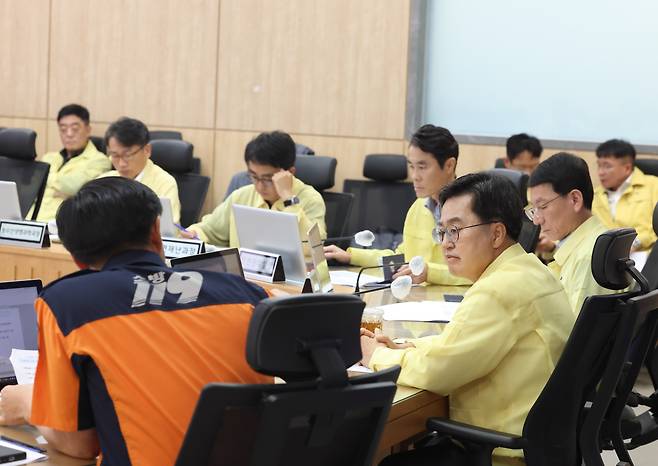 | ▲ 김동연 경기도지사가 21일 오전 경기도청에서 김성중 행정1부지사, 김재병 경기도소방재난본부장 등이 참석한 가운데 집중호우 피해의 신속 수습.복구 지원을 위한 긴급대책회의를 주재하고 있다. |