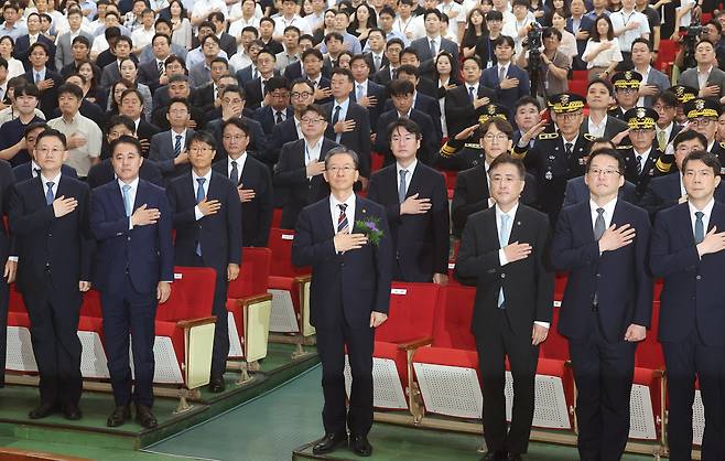 | ▲ 국기에 경례하는 정성호 장관 정성호 법무부 장관(앞줄 가운데)이 21일 정부과천청사에서 열린 취임식에서 국기에 경례하고 있다. |