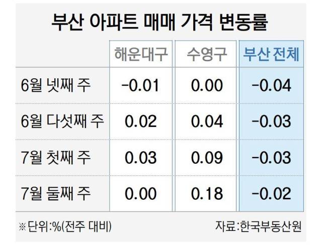 하지만 부산 전체 아파트 매매가격은 7월 둘째 주에도 0.02% 떨어지며 2022년 6월부터 시작된 하락세가 3년 넘게 지속되고 있다. 해운대구와 수영구를 제외한 부산 14개 구·군은 전반적으로 하락세가 이어지고 있다. 시장이 극도로 침체된 상황이지만, ‘이제는 바닥을 찍었다’는 심리에 주거 상급지를 중심으로 투자 수요가 몰리는 것이다.
