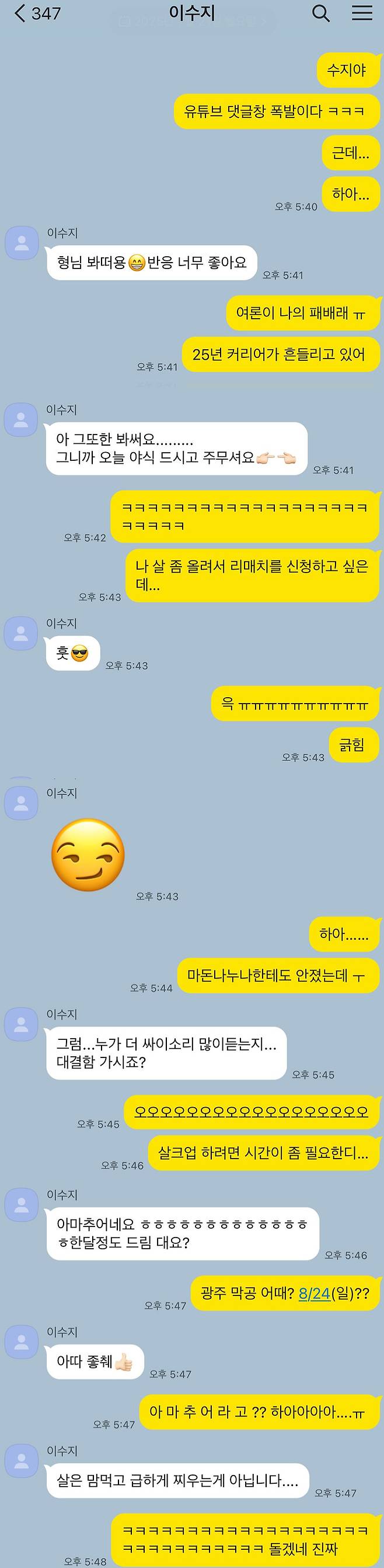 공연 종료 후, 싸이는 이수지와의 카카오톡 대화에서 “유튜브 댓글창 폭발이다. 근데 여론이 나의 패배래. 25년 커리어가 흔들리고 있어”라며 너스레와 함께 솔직한 심경을 밝혔다.