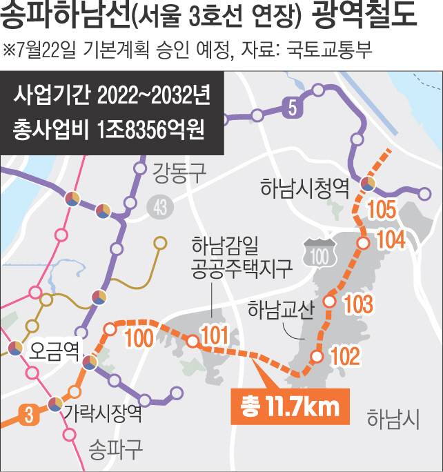 국토교통부 대도시권광역교통위원회(대광위)는 서울 지하철 3호선 연장사업인 송파하남선 광역철도 기본계획을 22일 승인할 계획이라고 21일 밝혔다.