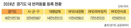21일 경기도 공공데이터에 따르면 지난해 기준 도내에 등록된 반려동물 수는 16만1천739마리로 집계됐다. 이 가운데 14만5천223마리는 동물병원 등 대행업체를 통해, 5만4천687건은 보호자가 직접 시·군·구청에 등록한 경우다. 등록 방식도 내장형·외부장치형·인식표형으로 구분돼 있는 등 생전에는 비교적 체계적인 관리가 이뤄지고 있다. → 표 참조