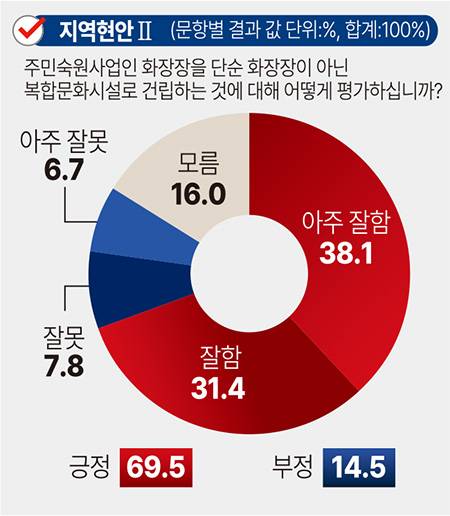 21일 중부일보 의뢰로 여론조사기관 데일리리서치가 이천시 거주 만 18세 이상 남녀 503명을 대상으로 지난 19일부터 20일까지 이틀간 실시한 여론조사 결과(95% 신뢰수준에 오차범위 ±4.4%p)에 따르면 '주민숙원사업인 화장장을 단순 화장장이 아닌 복합문화시설로 건립하는 것을 어떻게 평가하느냐'라는 질문에 응답자 69.5%가 긍정적이라고 답했다.
