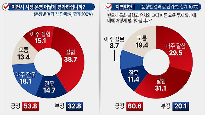 21일 중부일보 의뢰로 여론조사기관 데일리리서치가 이천시 거주 만 18세 이상 남녀 503명을 대상으로 지난 19일부터 20일까지 이틀간 실시한 여론조사 결과(95% 신뢰수준에 오차범위 ±4.4%p)에 따르면 '이천시의 전반적인 시정 운영에 대해 어떻게 생각하는가'라는 물음에 응답자 53.8%가 긍정적으로 평가했다.