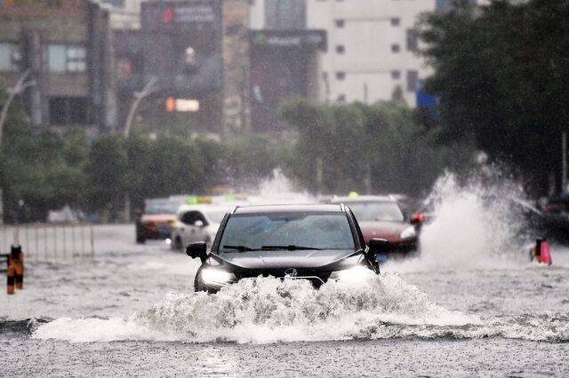 중국 하이난성 하이커우시에서 20일(현지시간) 제6호 태풍 '위파'의 영향으로 침수된 도로를 자동차들이 물살을 가르며 이동하고 있다. 중국 광둥성 주장 삼각주 등 태풍 상륙 지역에선 주민 67만명이 대피했고, 선전과 홍콩특별행정구역 등 인근 주요 공항에선 결항과 지연이 속출했다.