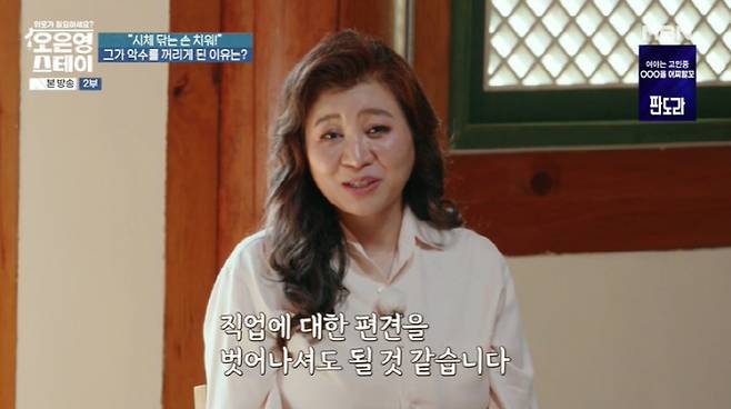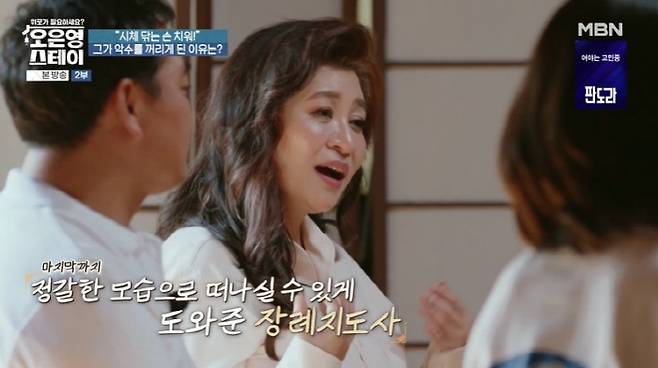 오은영은 "저희를 도와주신 장례지도사와 지금도 연락하고 있다. 왜냐면 저희 아버지가 국가유공자다. 6·25 참천용사셔서 평화의 숲에 모셨다가 국립호국원에 모셔야 하는데 지금까지 그걸 도와주고 계신다"며 "그런 것뿐만 아니라 아버지 떠나실 때 다 닦아드리고 머리 빗겨드리고 깨끗하게 해주시고 마지막에 아주 예쁜 수의를 입혀주시는데 너무 감사했다. 직업에 대한 편견을 벗어나셔도 될 거 같다"고 조언했다.
