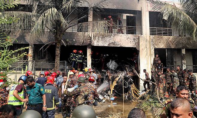 | 잔해 수습 21일(현지시간) 방글라데시 수도 다카에서 구조대원과 군인들이 학교 캠퍼스에 추락한 공군 훈련기 잔해를 수습하고 있다. 다카=AFP연합뉴스 |