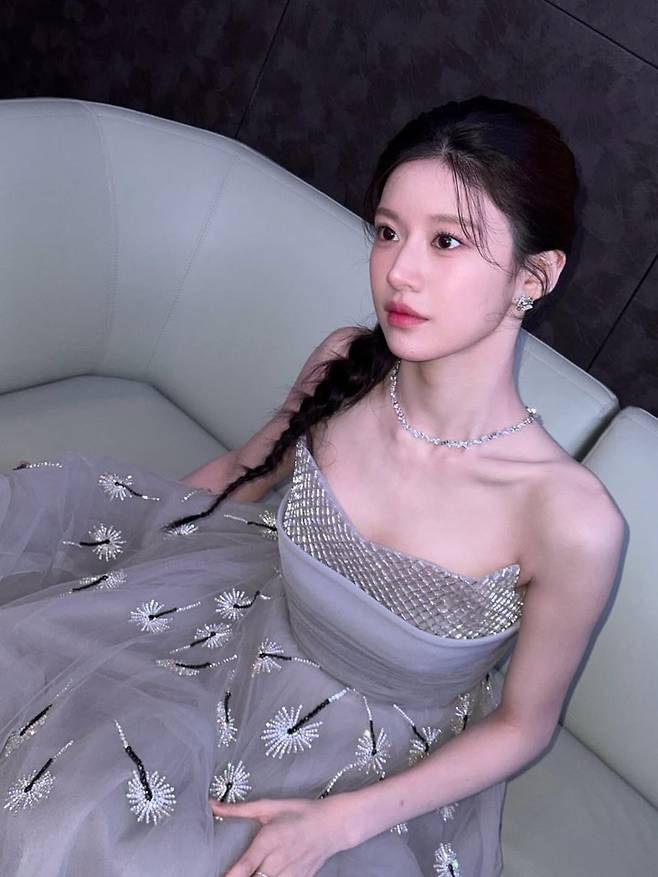 사진 속 고윤정은 크리스털 비딩이 촘촘히 박힌 실버 톤 드레스를 착용해 고급스러움을 더했고, 바디라인을 자연스럽게 따라 흐르는 실루엣은 단아함을 배가시켰다. 깔끔하게 땋은 사이드 브레이드와 이마 옆에 자연스럽게 떨어뜨린 잔머리는 클래식한 고전미를 자아낸다.