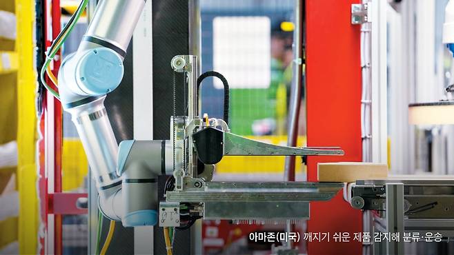 아마존은 지난 5월 신형 로봇인 벌컨을 공개했다. 벌컨은 물류 창고에서 주로 작동하는데, 팔 관절과 손에 달린 6개의 센서가 얼마나 부드럽게 접촉하는지, 어떤 힘을 가하는지, 얼마나 비틀리는지를 실시간으로 측정한다. 이를 통해 AI 로봇이 물체를 파손하지 않도록 힘의 세기와 방향을 조절한다. 이런 기술 덕분에 깨지거나 터지기 쉬운 물건을 손상 없이 분류·운송할 수 있다.
