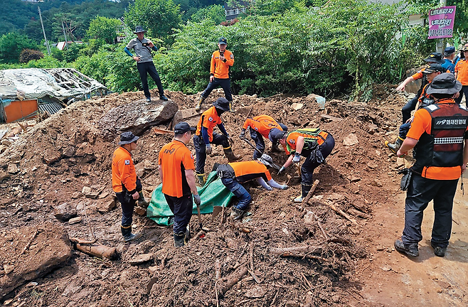 흙더미-바위 뒤덮여 수색 난항… “그래도 이웃 찾아야죠” 팔걷어