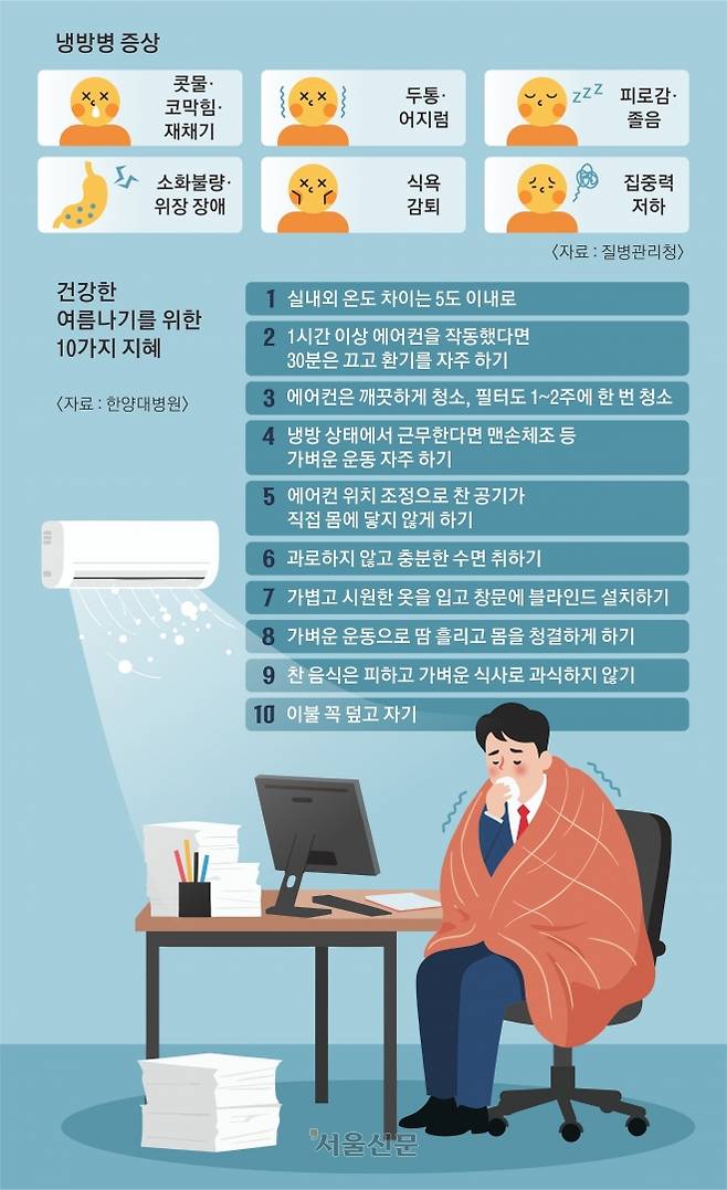 #. 직장인 오승준(40·가명)씨는 최근 사무실에서 일하다 원인 모를 몸살 기운과 근육통에 시달렸다. 며칠 전 에어컨 바람이 직접 닿는 자리로 옮기고 나서 증상이 시작됐다. 감기약을 먹어도 낫지 않고, 종일 으슬으슬 떨리고 두통까지 찾아왔다. 오씨는 “목과 어깨가 계속 뻐근하고 속도 더부룩해 밥맛이 없었다”며 “아침에 일어날 때마다 기운이 없고 손발이 저릿할 정도였다”고 말했다.