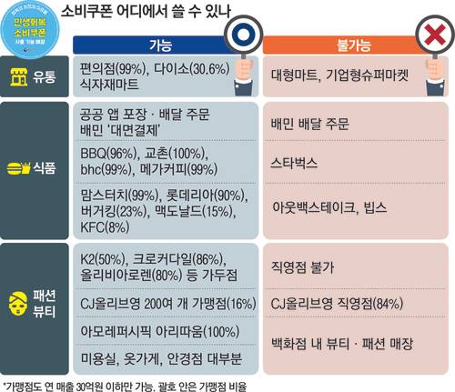이날 업계에 따르면 이 쿠폰은 대형마트, 백화점, 유흥업소를 제외한 연 매출 30억원 이하의 소상공인 가맹점과 일반 가게에서 쓸 수 있다. 대표적인 사용처로는 외식 프랜차이즈 가맹점이 꼽힌다. 다만 같은 브랜드라도 직영점은 해당하지 않고, 가맹점 역시 연 매출 30억원 이하인 곳만 가능하다.