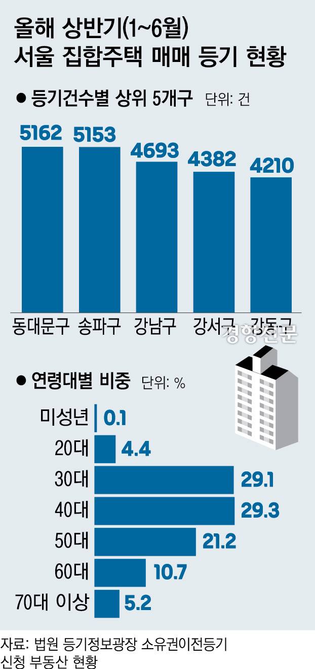 올해 상반기 서울 집합건물 매매가 1년전보다 30% 이상 늘어난 것으로 나타났다. 거래 절반 이상은 ‘한강벨트’에 집중됐지만 매매가 가장 활발히 이뤄진 곳은 올초 신축 대단지 아파트 입주가 시작된 동대문구였다. 서울 강남구에선 50대와 70대가 주로 집을 팔고 40대가 주로 집을 샀으며, 올해 상반기는 70대 이상 고령층의 매수도 1년전보다 증가했다.