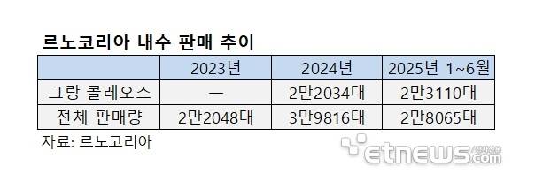 그랑 콜레오스 인기에 힘입어 르노코리아의 상반기 내수 판매량은 2만8065대를 기록하며 전년 동기 대비 150.3% 증가했다. 수출을 포함한 상반기 전체 누적 판매량은 4만7027대로 11.6% 늘었다.