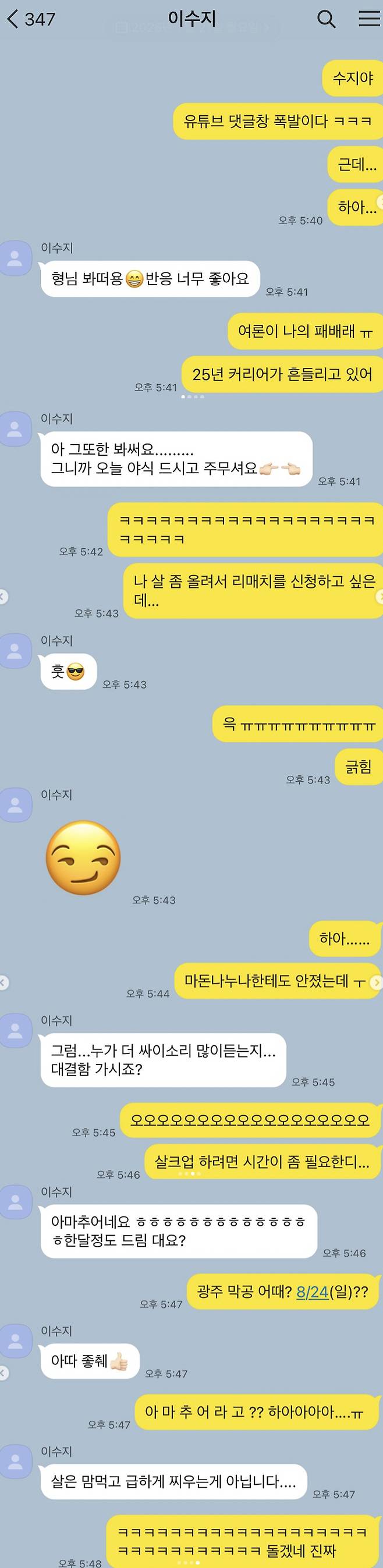 싸이는 21일 자신의 계정에 이수지와의 카카오톡 메시지 대화 내용을 공개했다. 싸이는 이수지에게 "댓글창 폭발이다. 그런데 여론이 나의 패배래. 25년 커리어가 흔들리고 있다. 나 살 좀 올려서 리매치를 신청하고 싶다"고 청했다.