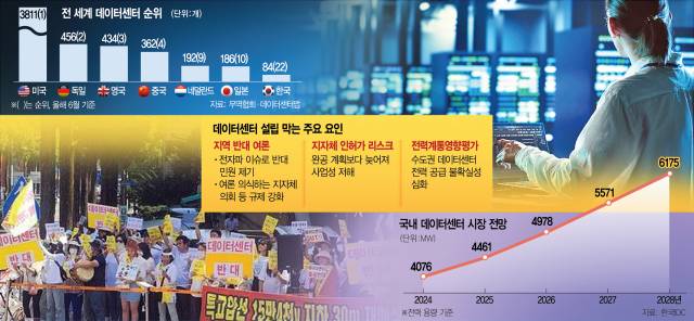 이러한 지자체 리스크는 수도권 내 데이터센터 사업을 막는 주된 요인으로 작용하고 있다. 수도권에 집중된 전력수요의 지방 분산을 유도하는 전력계통영향평가제도까지 겹쳐 경기도나 서울에서 데이터센터 착공은 현재 크게 더딘 상황이다. 한국무역협회·데이터센터맵에 따르면 국내 데이터센터 수는 올해 6월 기준 84개로, 전 세계 22위에 그쳤다. AI 패권을 확고히 다지려는 미국에는 이미 3811개가 들어서 있다.